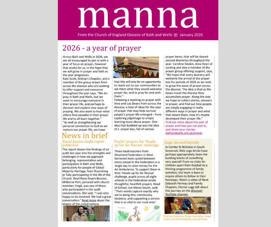 The January issues of Manna mailing and the Prayer Calendar are now available to download and read. It features news and information on the 2026 Year of Prayer, including an interview with Revd Jane Durham, Assistant Area Dean of Glastonbury, who reflects on the role of pilgrimage as part of the Year of Prayer. The issue also includes a New Year message from Bishop Michael, and news from across the diocese.
