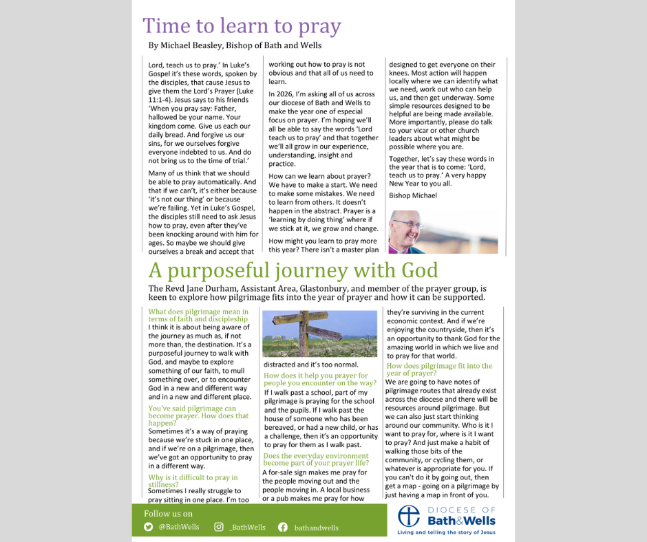 The January issues of Manna mailing and the Prayer Calendar are now available to download and read. It features news and information on the 2026 Year of Prayer, including an interview with Revd Jane Durham, Assistant Area Dean of Glastonbury, who reflects on the role of pilgrimage as part of the Year of Prayer. The issue also includes a New Year message from Bishop Michael, and news from across the diocese.