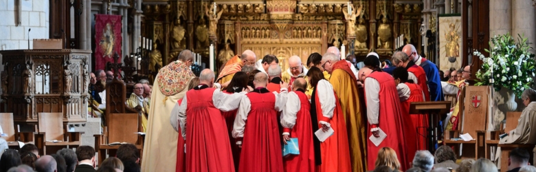 Later in the service the archbishop and other bishops present laid their hands on each ordinand in turn. Fiona and Jean were then both presented with a Bible by the Archbishop of York, who then anointed the new bishops, and gave them their pectoral cross and episcopal ring. The new bishops were then welcomed with heartfelt applause by those present. At the end of the service both bishops were given their pastoral staff.